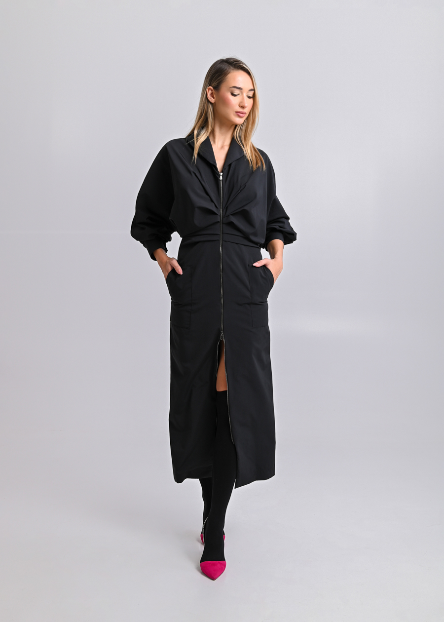 Midi kimono-style dress made of waterproof fabric. Has wide sleeves with tight wrist cuffs. Fastens in the front with a two-way zipper.
