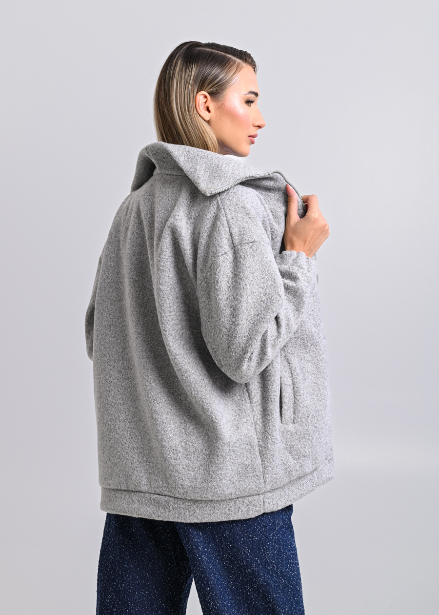 An oversized bomber jacket blending comfort and style, featuring a modern front zip,