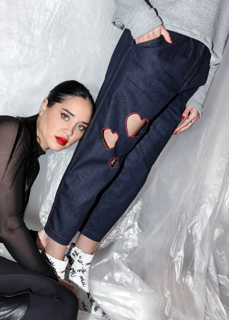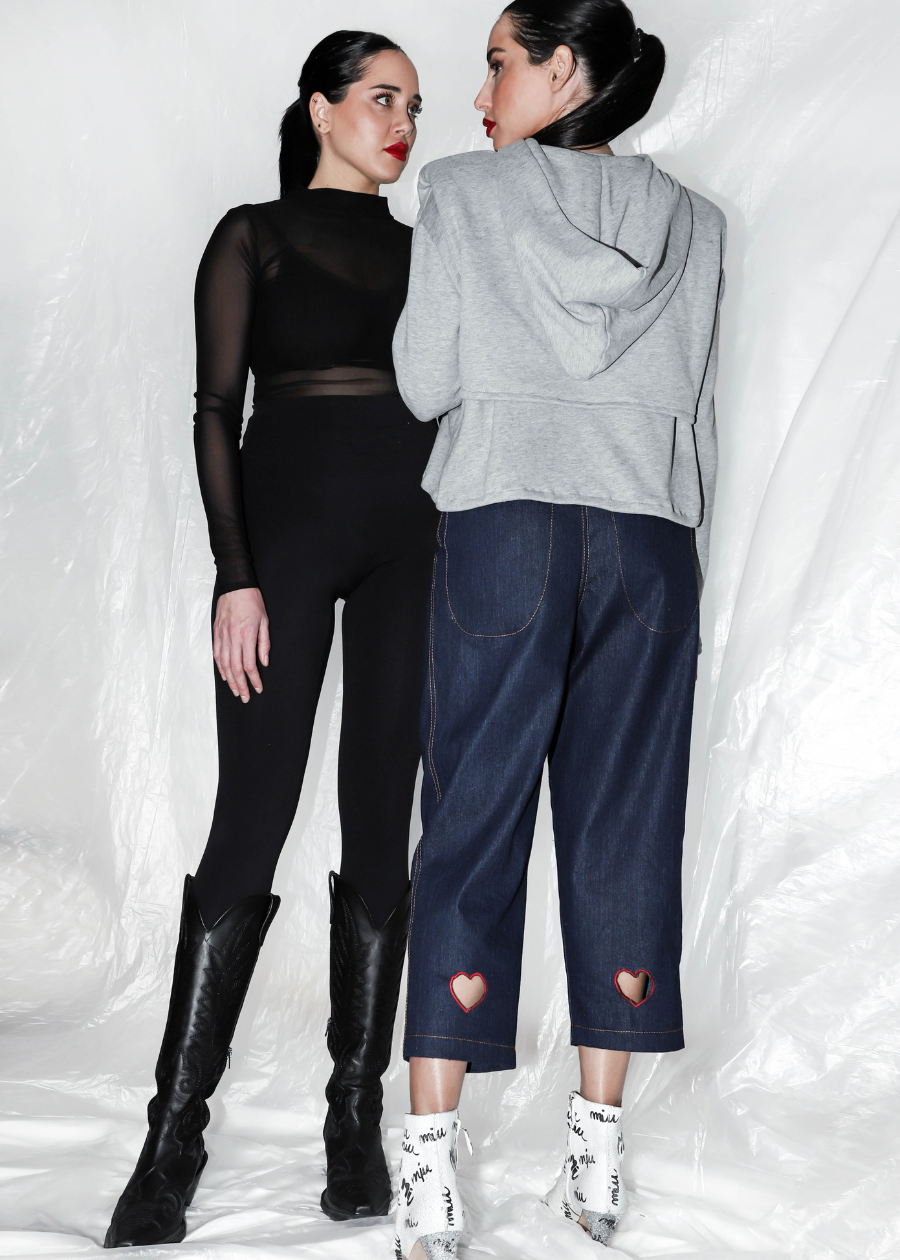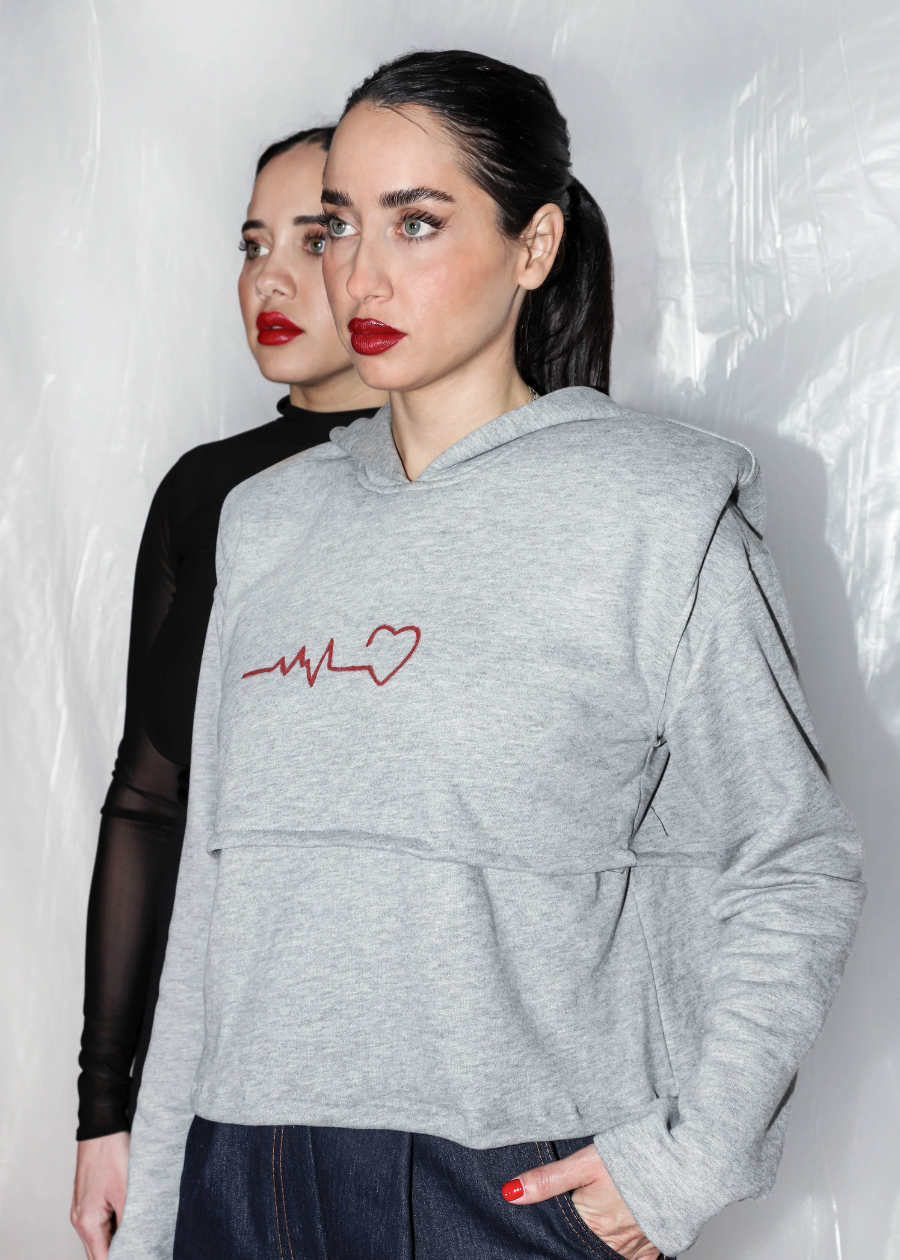 Διπλό φούτερ που αποτελείται από ένα μακρυμάνικο τοπ με κλασικού τύπου λαιμόκοψη και ένα δεύτερο crop , με βάτες και κουκούλα. Χειροποίητα ζωγραφισμένο το καρδιογράφημα στην μπροστινή όψη του crop top.