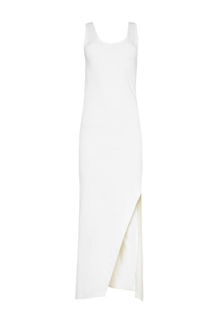 Maxi φόρεμα ελαστικό σε ίσια γραμμή. Έχει ένα λοξό άνοιγμα στο μπροστινό μέρος.