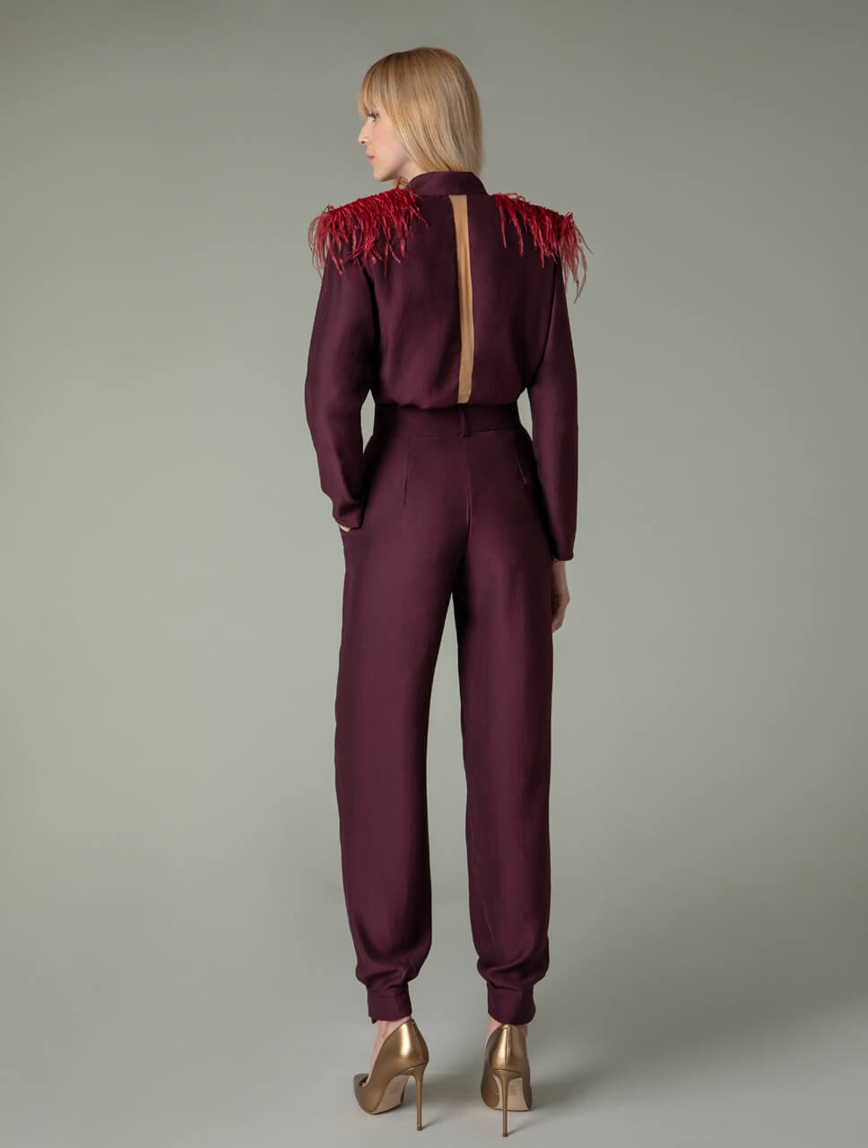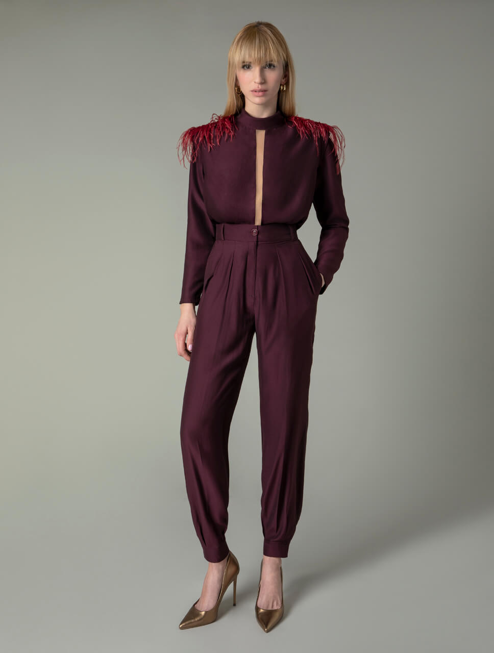 Ανδρόγυνο παντελόνι με πιέτες και τσέπες. Ζωνάκι με φερμουάρ και κουμπί στο κλείσιμο. Στο τελείωμα του παντελονιού, στο κάθε μπαντζάκι, υπάρχει μία τύπου “μανσέτα” ποδιού.