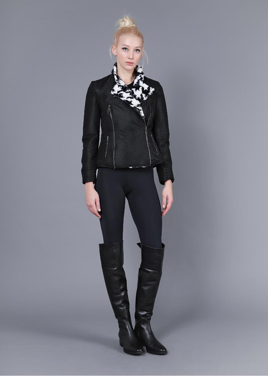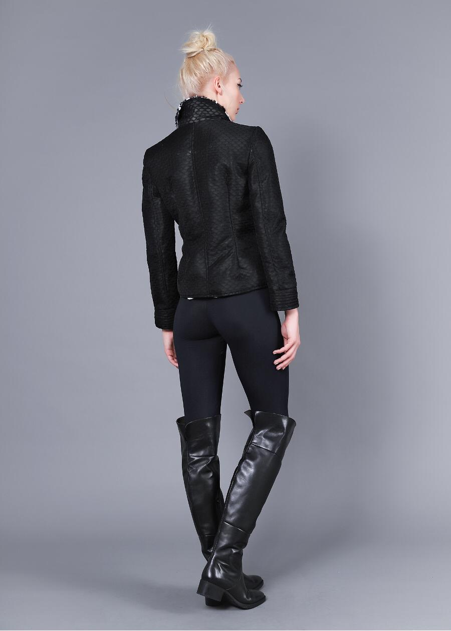 Bike Jacket από σκληρό 3D τούλι (σχηματίζει στο εσωτερικό του καρό), με γούνινη ασπρόμαυρη ( pied de coq)επένδυση. Μεγάλος γιακάς. Κλείνει με μεταλλικό φερμουάρ. Υπάρχουν δύο τσέπες πλαινές που κλείνουν επίσης με φερμουάρ ενώ έχει και ένα επιπλέον φερμουάρ που λειτουργεί ως διακοσμητικό στοιχείο του ρούχου.
