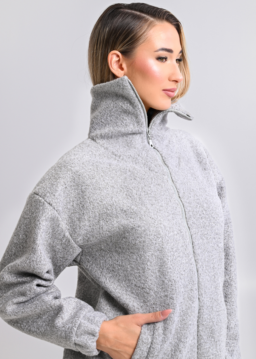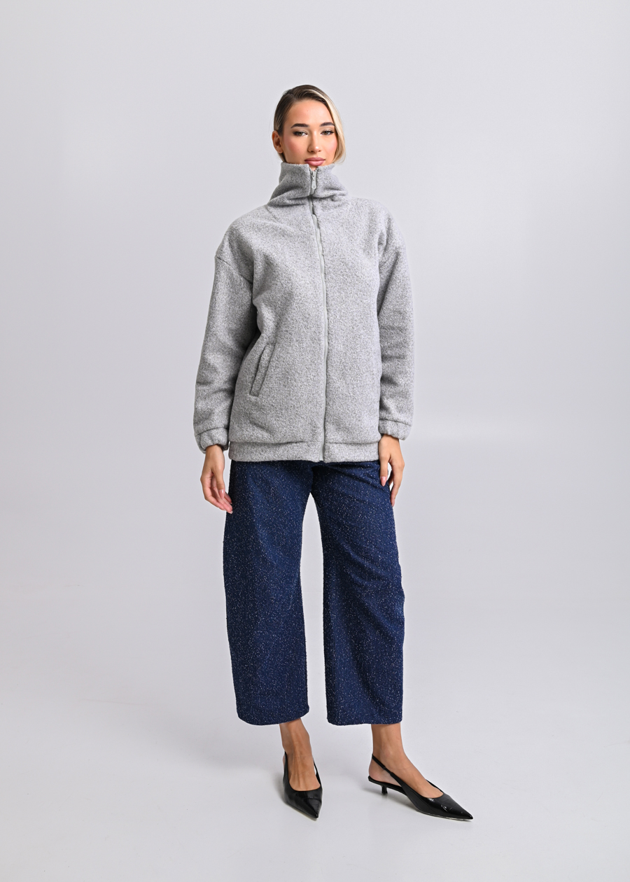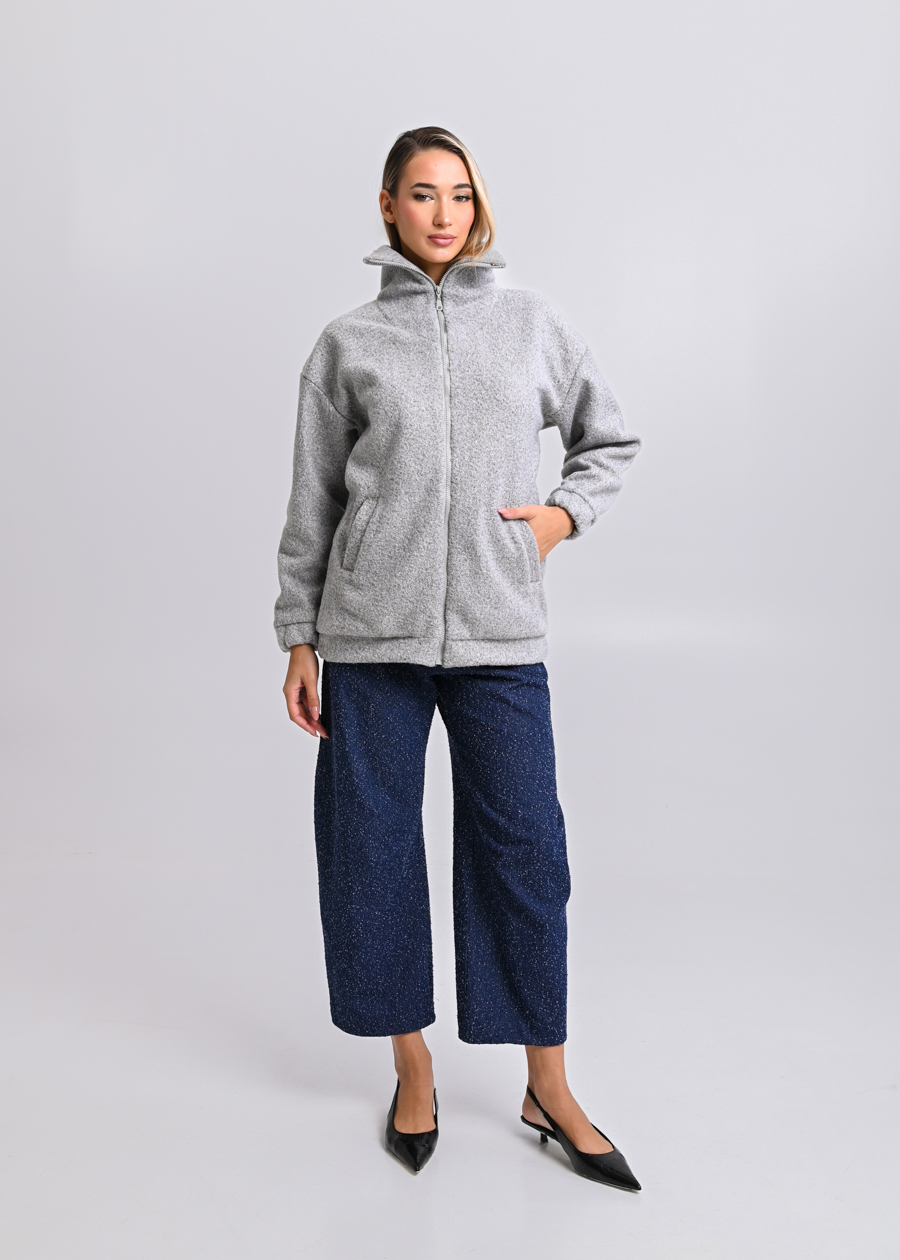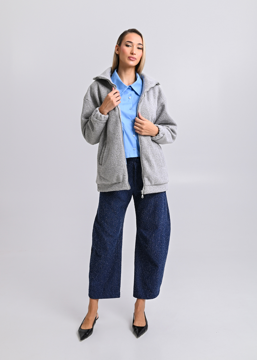 Ένα φαρδύ bomber jacket που συνδυάζει άνεση και στυλ , με μοντέρνο φερμουάρ μπροστά, λεπτομέρειες με λάστιχο
