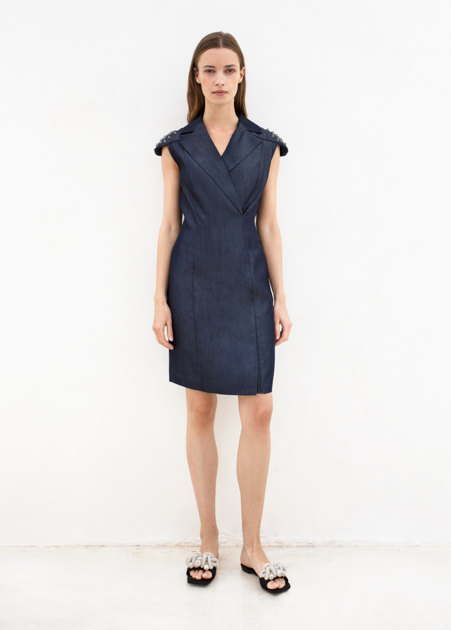Midi φόρεμα σε ίσια γραμμή από σταθερό τζήν ύφασμα.