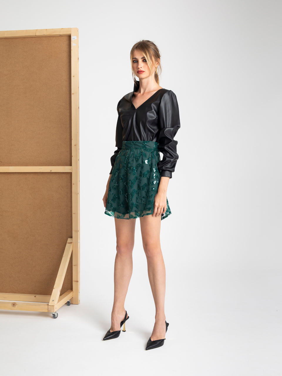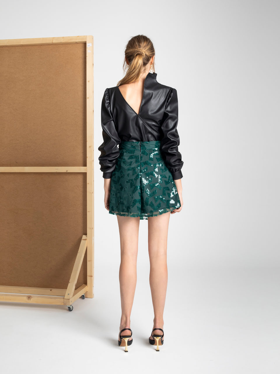 Δερματίνη μαύρη πολυμορφικό top.Είναι τρία κομμάτια που ενώνονται στο κέντρο με διπλόγαζο.Το ένα κομμάτι καταλήγει σε ζιβάγκο ενώ το δεύτερο σε “v”. Ελαφριά σούρα στο μανίκι και μανσέτα στο τελείωμα.