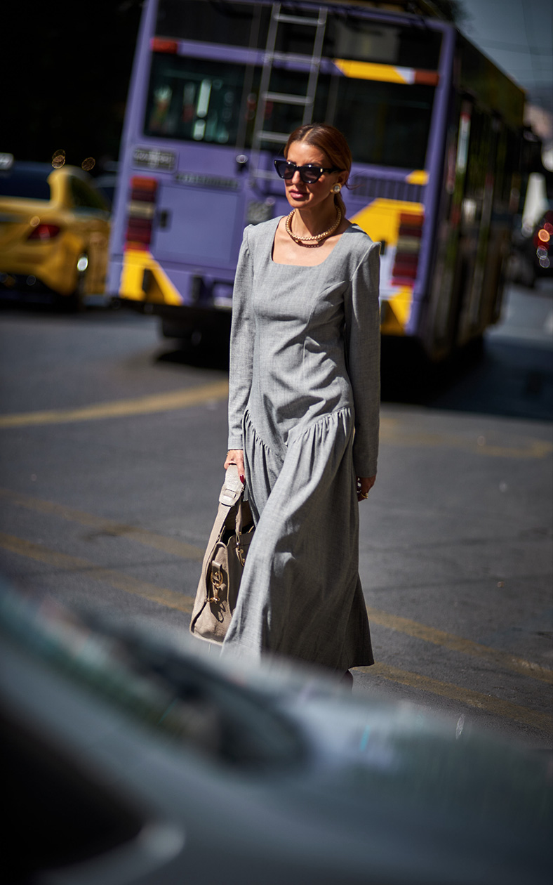 Δεξιά και αριστερά της περιφέρειας το ύφασμα κάνει σούρα δίνοντας ένταση και μία σοφιστικέ διάθεση στο ρούχο.