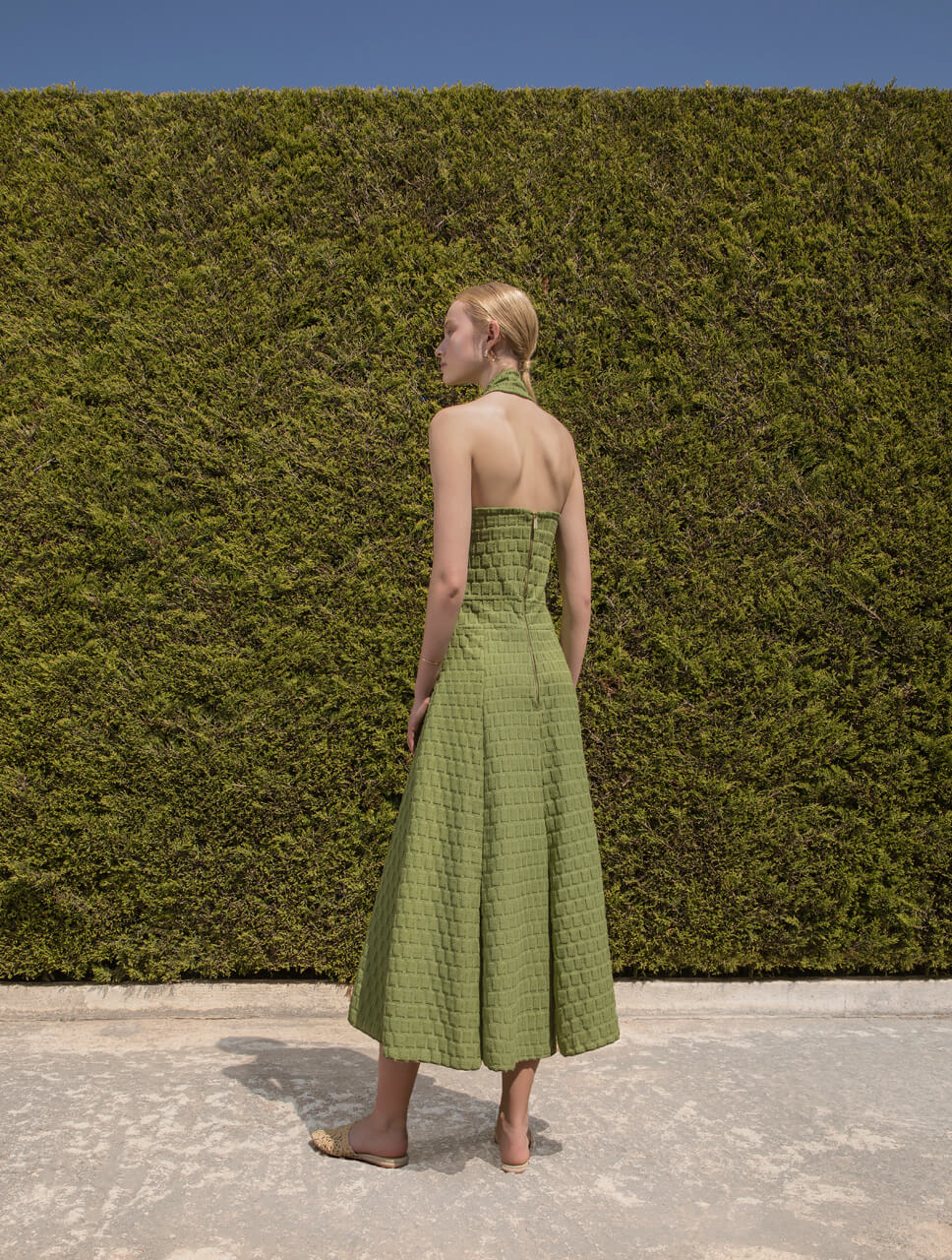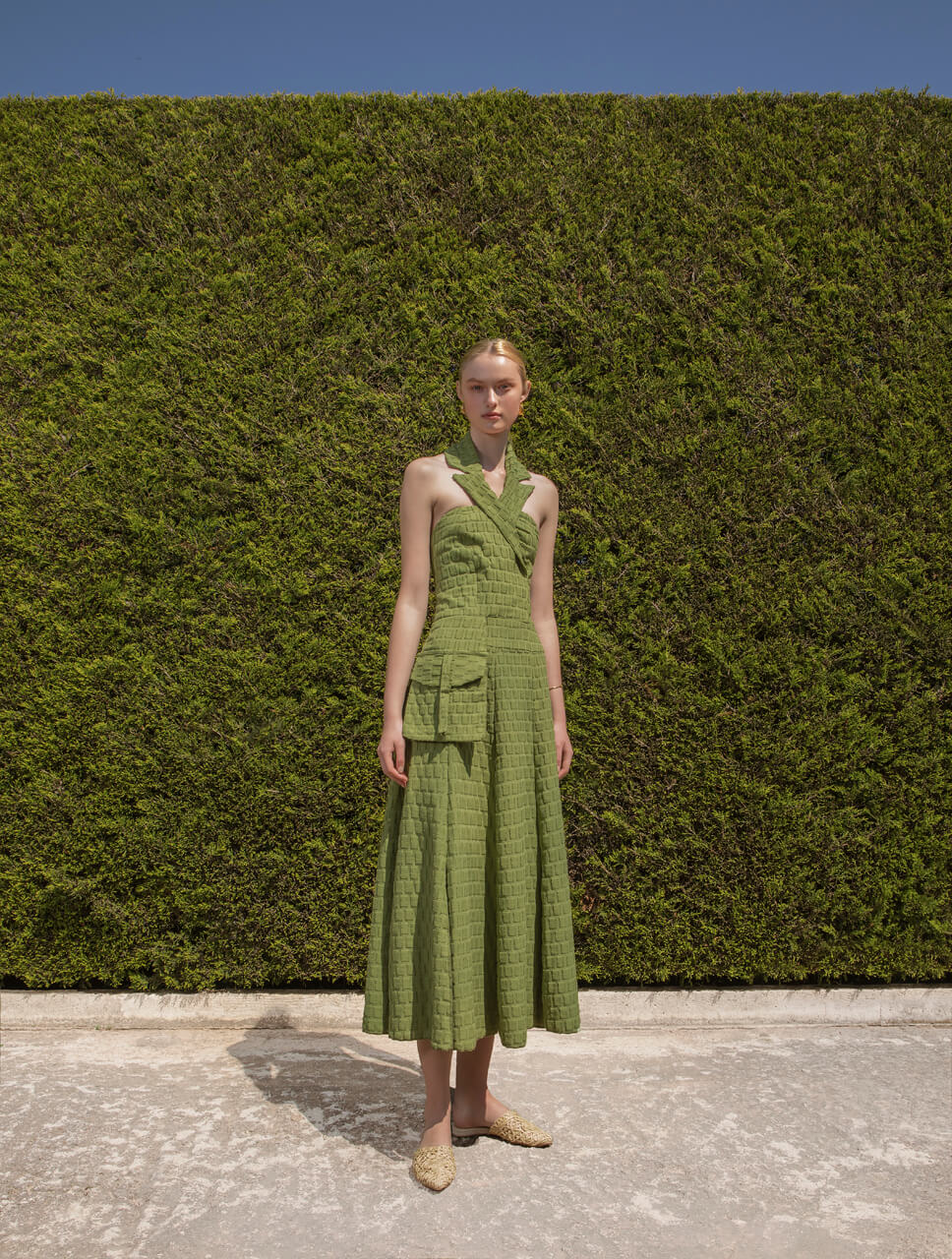 Φόρεμα midi, βαμβακερό, με ανοιχτή πλάτη. Υπάρχει γιακάς που ανεβαίνει και συγκρατείται στον λαιμό. Η Φούστα ακολουθεί την “Α” γραμμή και έχει ανοίγματα. Φερμουάρ στο πίσω μέρος.