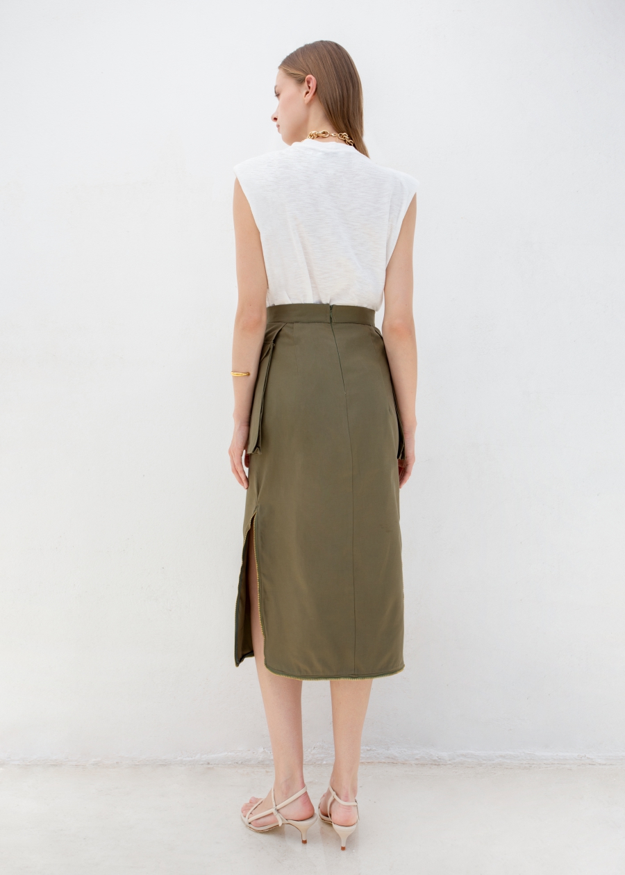 Midi ίσια φούστα με μεγάλες πλαϊνές – “αιωρούμενες”- τσέπες στρατιωτικού τύπου. Ανοίγματα στο πλάι που είναι στολισμένα με τρέσα φερμουάρ. Κλείνει στο πίσω μέρος με φερμουάρ.