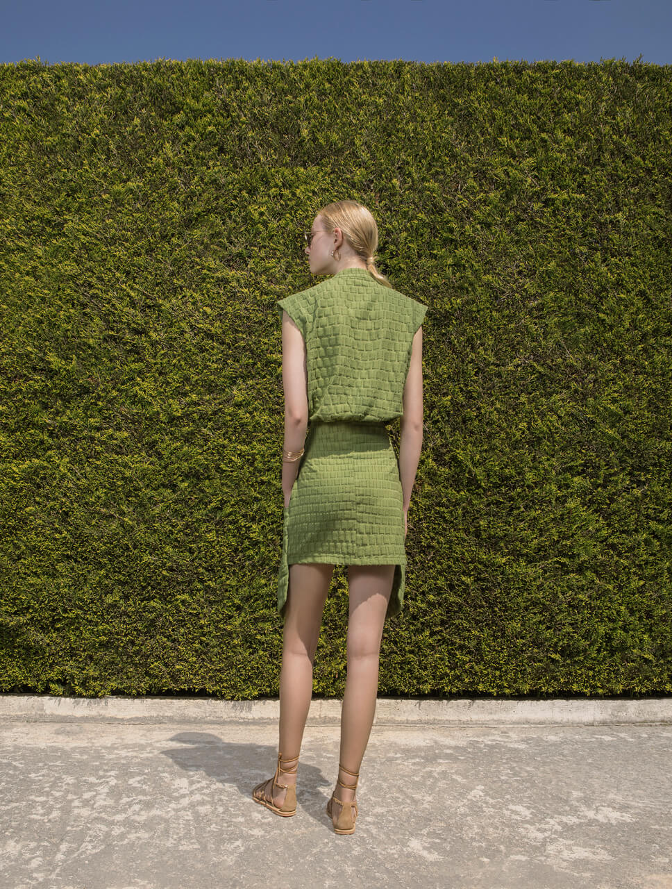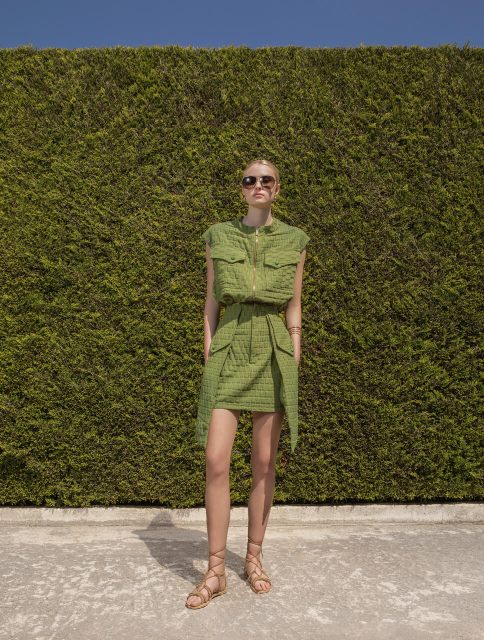 Φούστα Mini στρατιωτικού τύπου με τσέπες εμπρός. Οι τσέπες δημιουργούν layering με την φούστα (πιό μακριές από την φούστα) , κλείνουν με κουμπί ενώ έχουν και ένα έξτρα τσεπάκι ραμένο επάνω τους. Η φούστα κλείνει με φερμουάρ εμπρός.