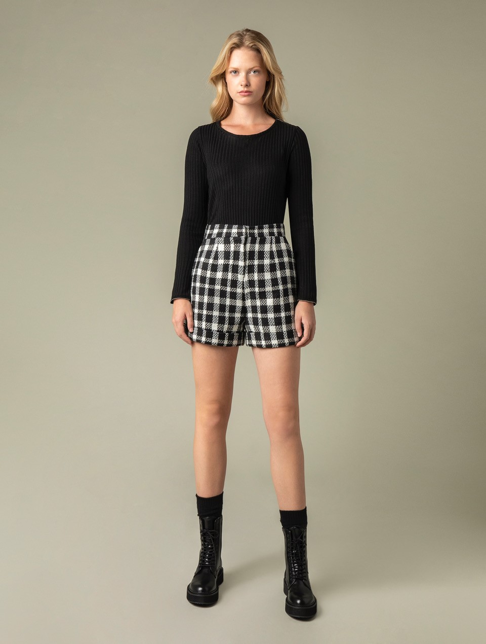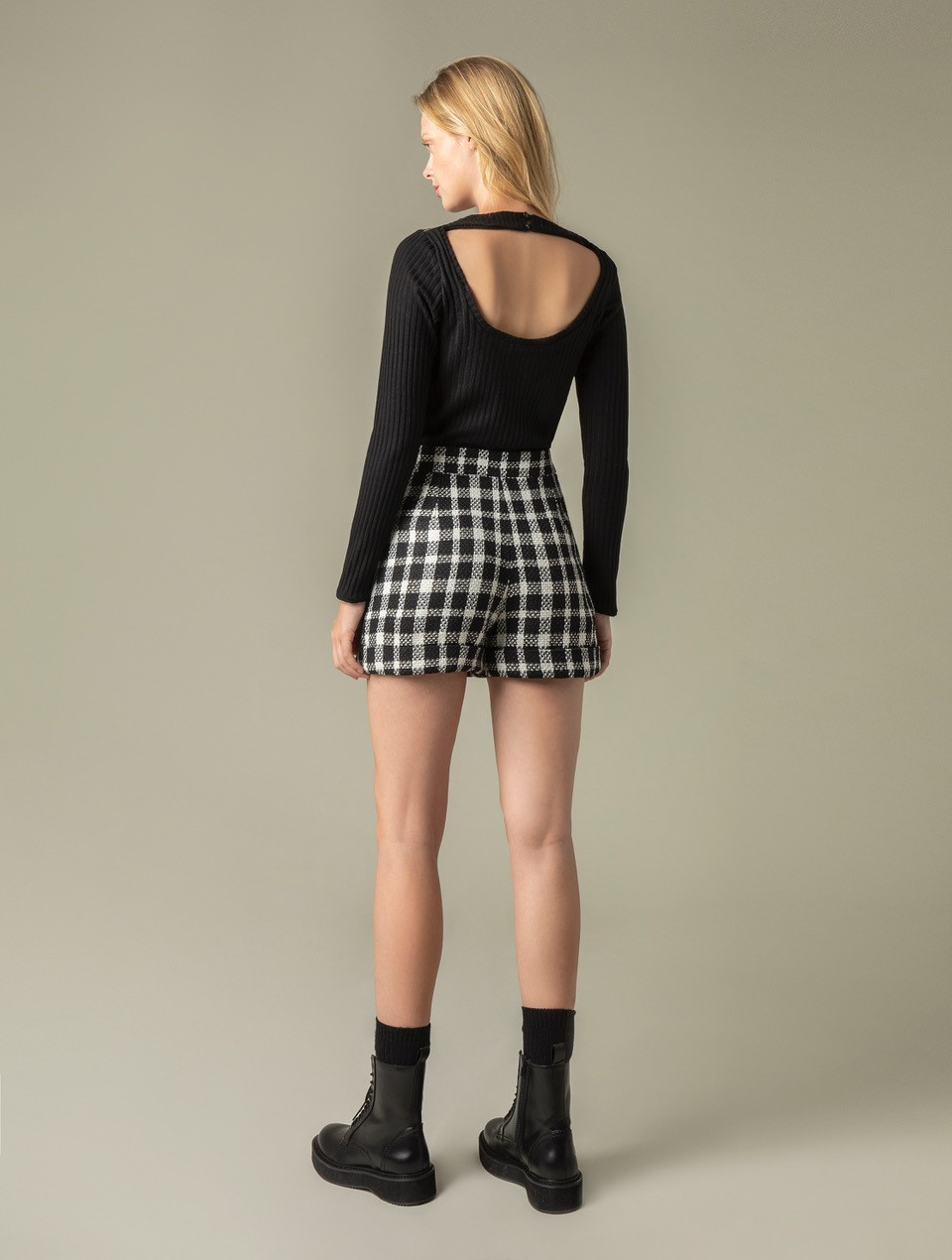 Καρό ασπρόμαυρο σορτσάκι με ζωνάκι, φερμουάρ και κουμπί. Τσέπες εμπρος και ρεβέρ στο τελείωμα.