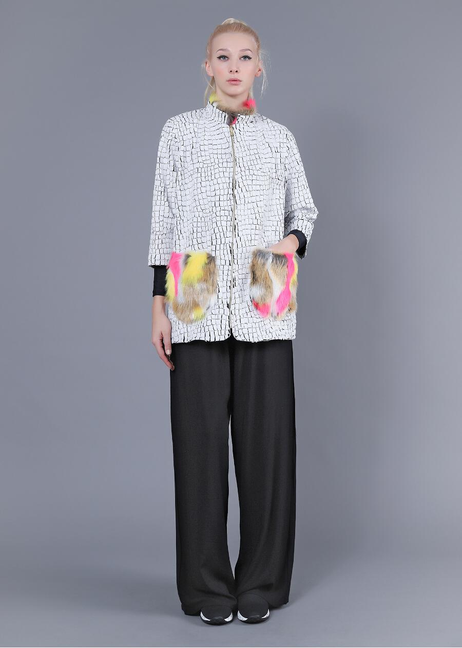 Lazer Cut ζακέτα με φερμουάρ μεταλλικό. Δύο τσέπες στο μπροστινό μέρος με επένδυση από γούνα (πολύχρωμη/ συνθετική). Ελαφρώς ψηλός λαιμός με εσωτερική επένδυση γούνα (πολέχρωμη/ συνθετική).