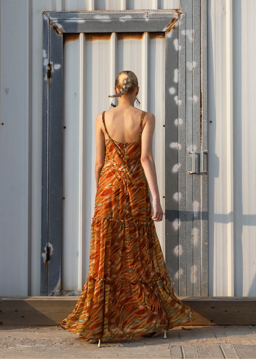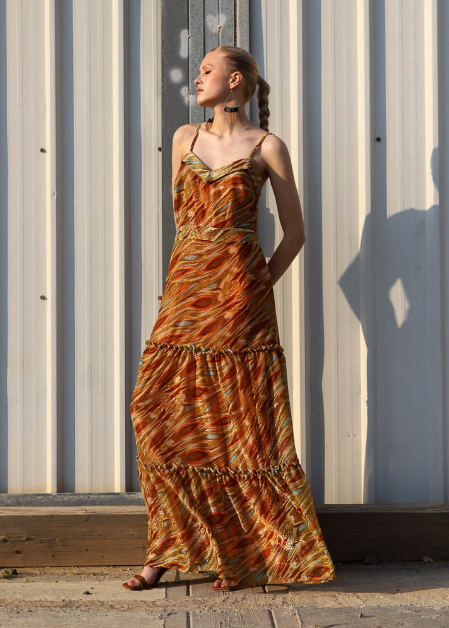 Στην μέση υπάρχει ζωνάκι και από εκεί και κάτω δημιουργείται φούστα σε τρία φύλλα τύπου boho.