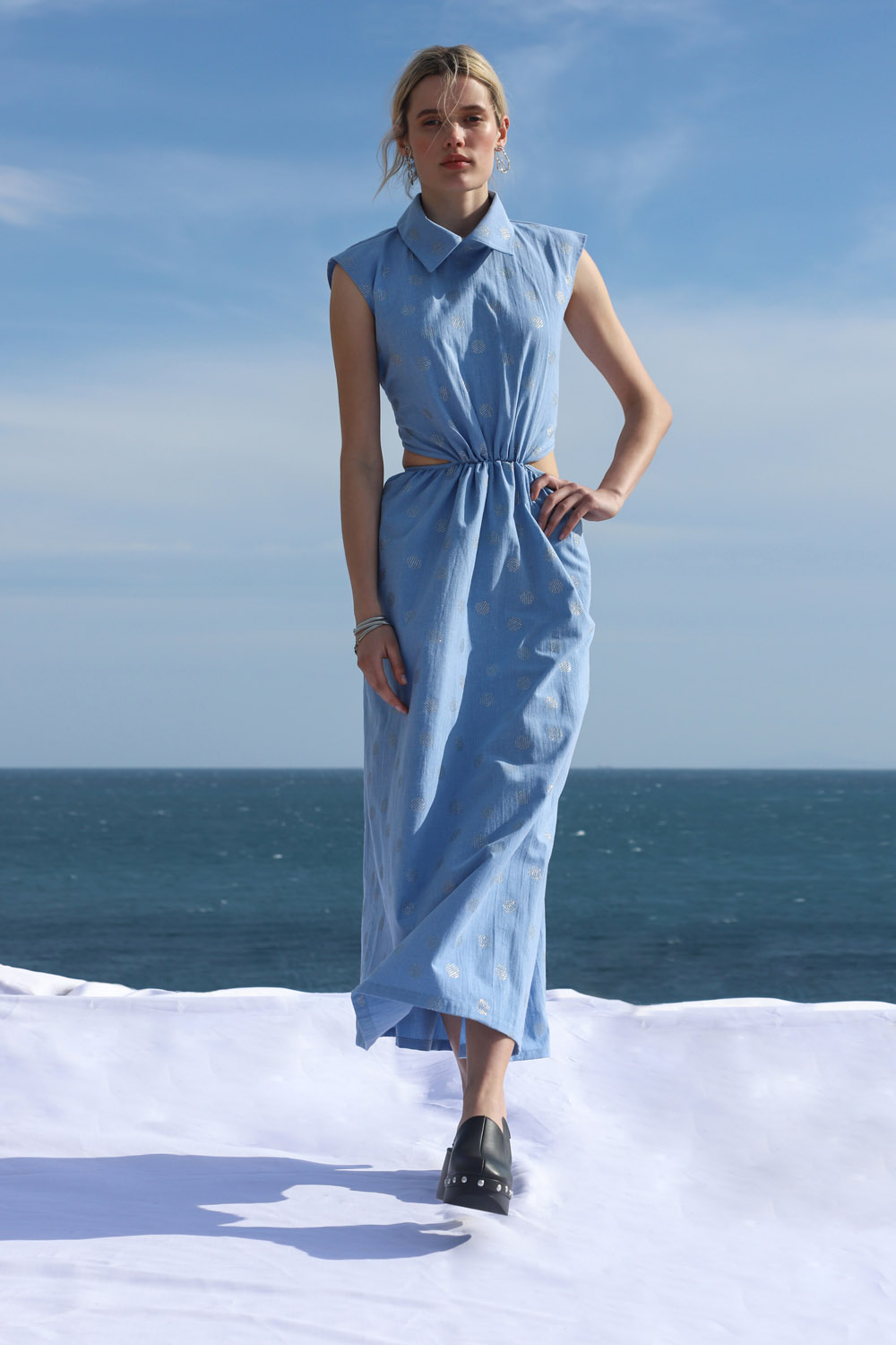Maxi Αμάνικο Φόρεμα με γιακά και κοψίματα στην μέση και την πλάτη. Ανοιχτόχρωμο τζην ύφασμα με διακριτικά ασημένια τυπώματα για επιπλέον λάμψη και κομψότητα. Η ραφή στην μέση του φορέματος τονίζει την θυλυκή γραμμή. Επιπλέον δύο βαθιά κοψίματα αφήνουν γυμνό μέρος της μέσης εμπρός και όλη την μέση πίσω. Υπάρχει λάστιχο στο πίσω μέρος και της φούστας και του πάνω μέρους του ενδύματος προσφέροντας άνεση. Κλείνει με φερμουάρ στο πίσω πάνω μέρος.