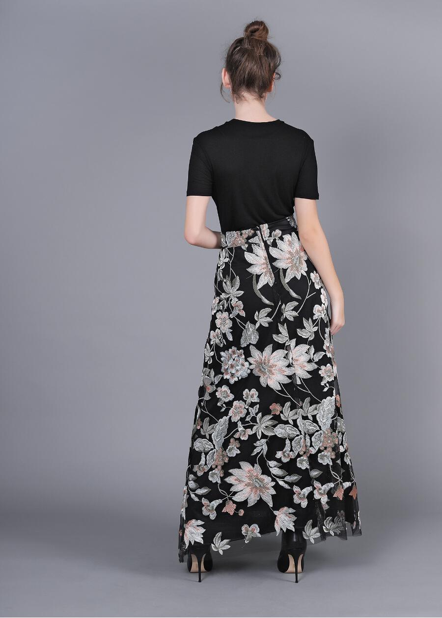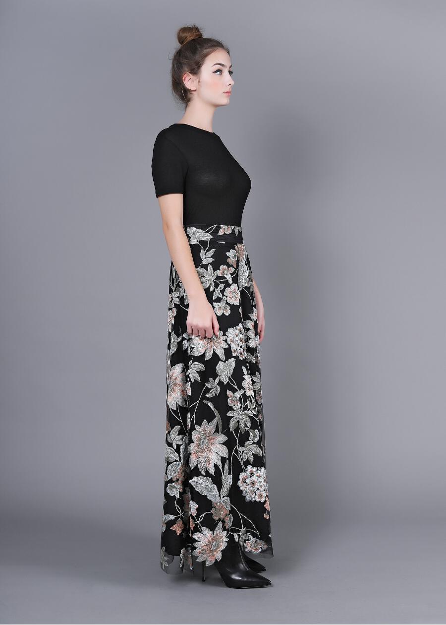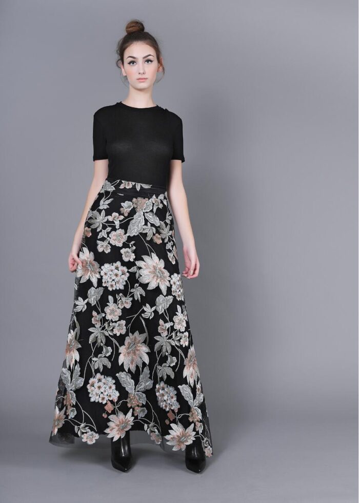 Maxi Φούστα Δαντέλα φλοράλ (κεντημένα λουλούδια) με μπάσκα και φερμουάρ και εσωτερική φόδρα. Ημίλοξη για να έχει κίνηση.