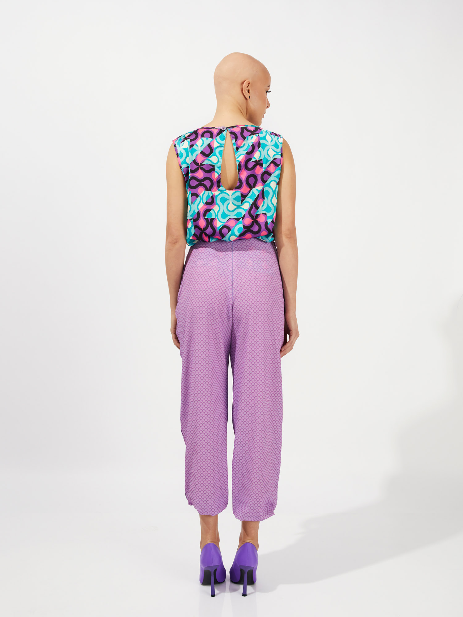 Αμάνικο τοπ με νερβίρ. Ρελάκι στην λαιμόκοψη και στα μανίκια. Κουμπώνει στο πίσω μέρος με κουμπί.
