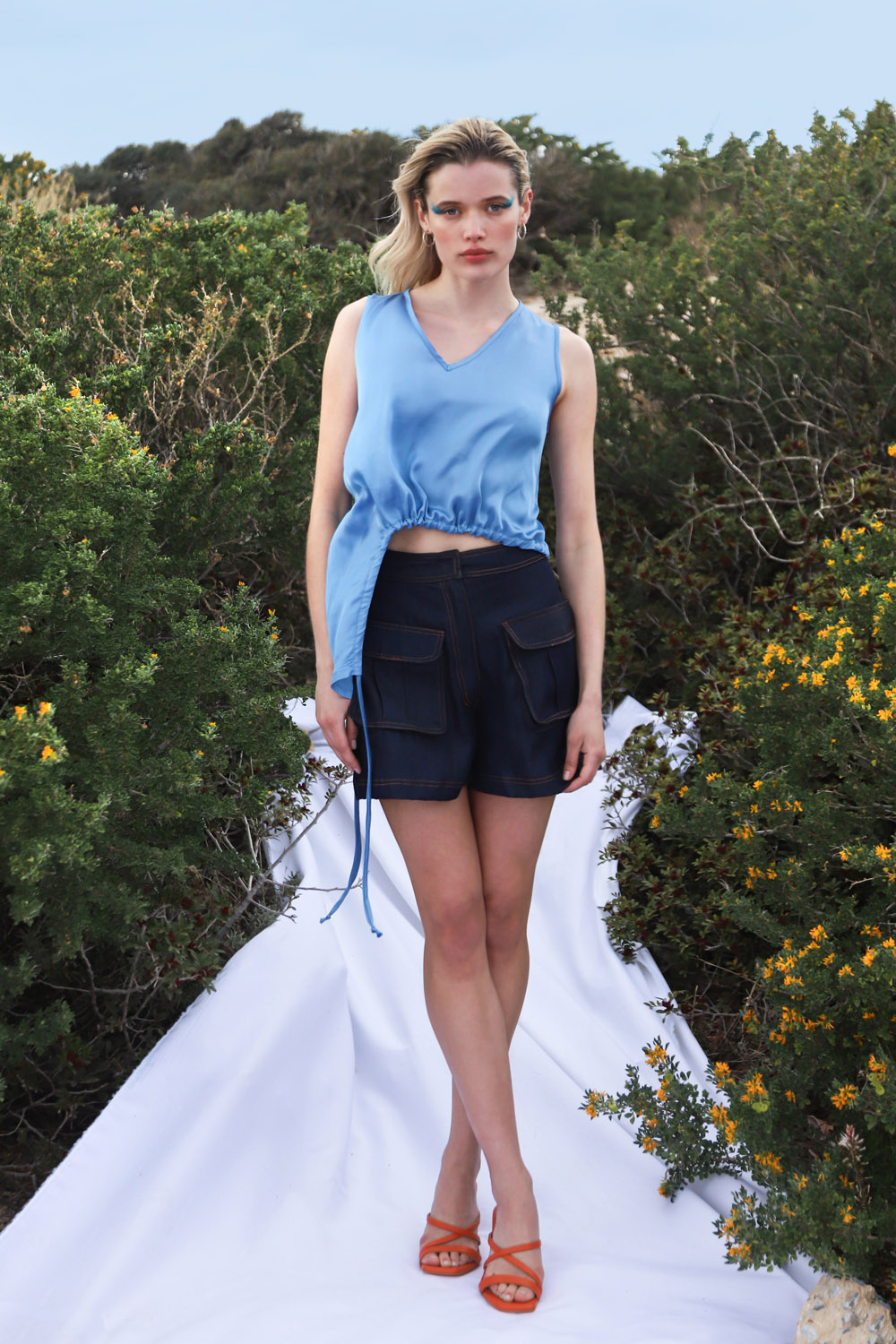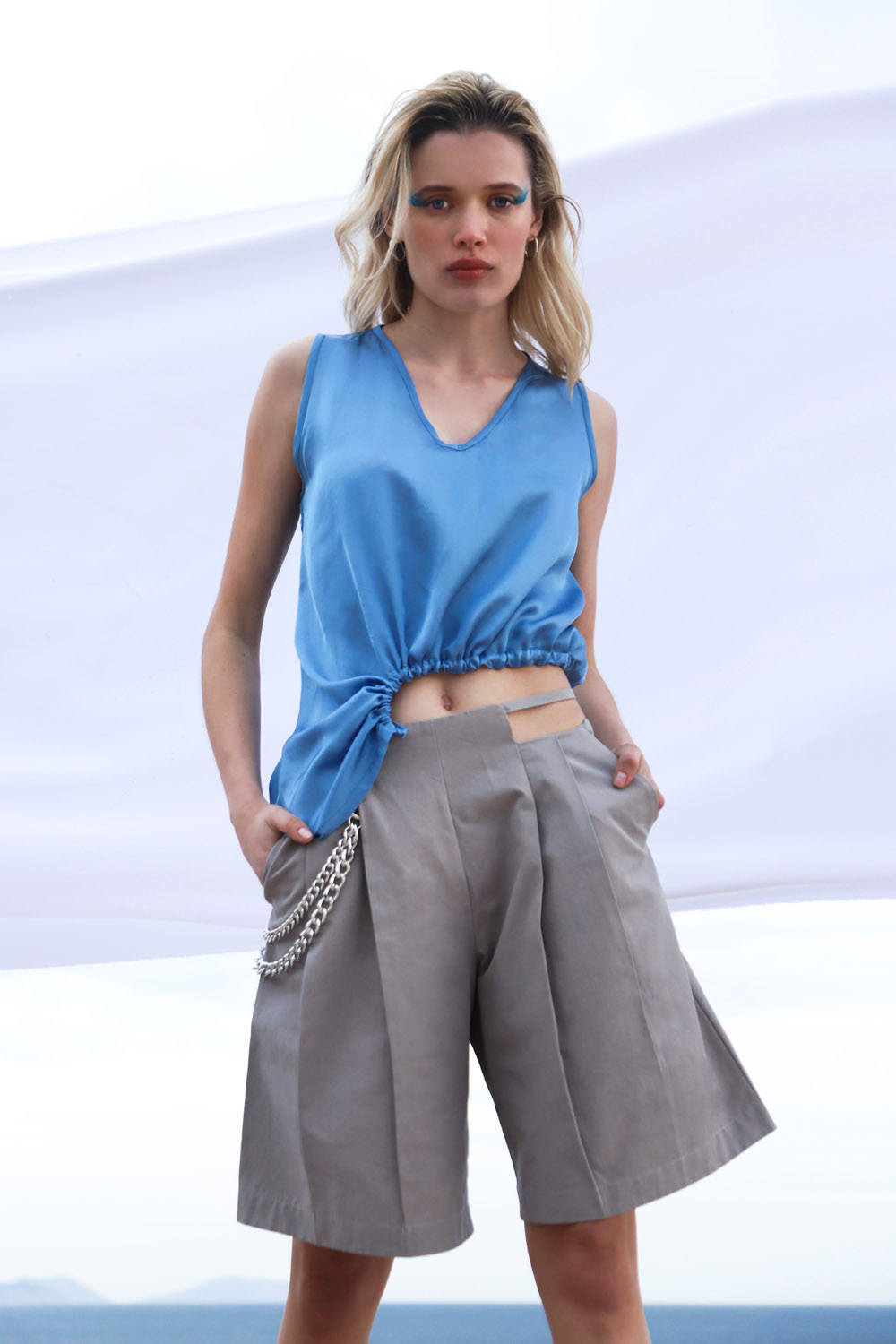 Αμάνικο σατέν τοπ με V λαιμόκοψη. Απλό και κομψό. Άνοιγμα στην μία πλευρά του ρούχου στην μέση που δημιουργεί μια φίνα λεπτομέρεια που τονίζει και ταυτόχρονα κολακεύει. Το κυκλικό αυτό άνοιγμα δημιουργεί σούρα που κλείνει με κορδόνια και μπορεί να σφίξει κατά βούληση. Δέσιμο στο πλάϊ.