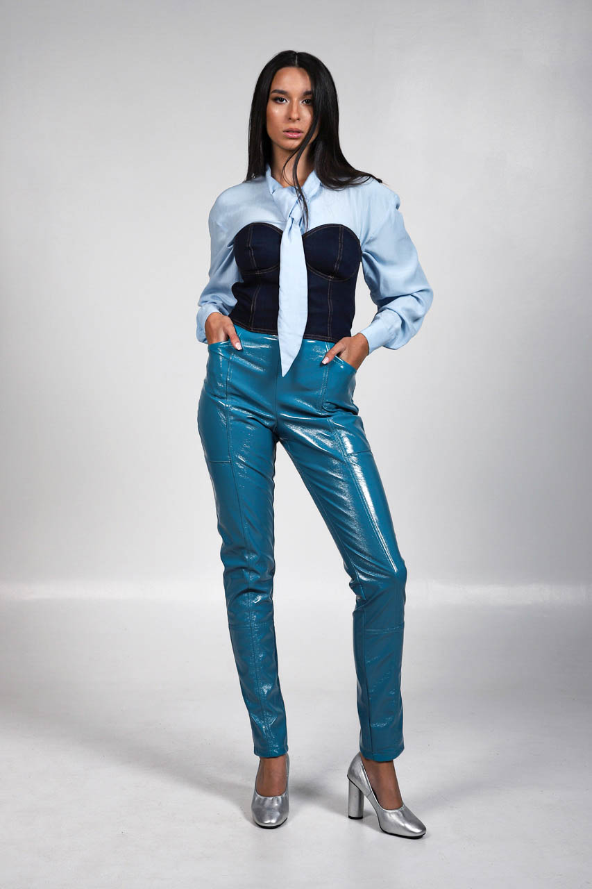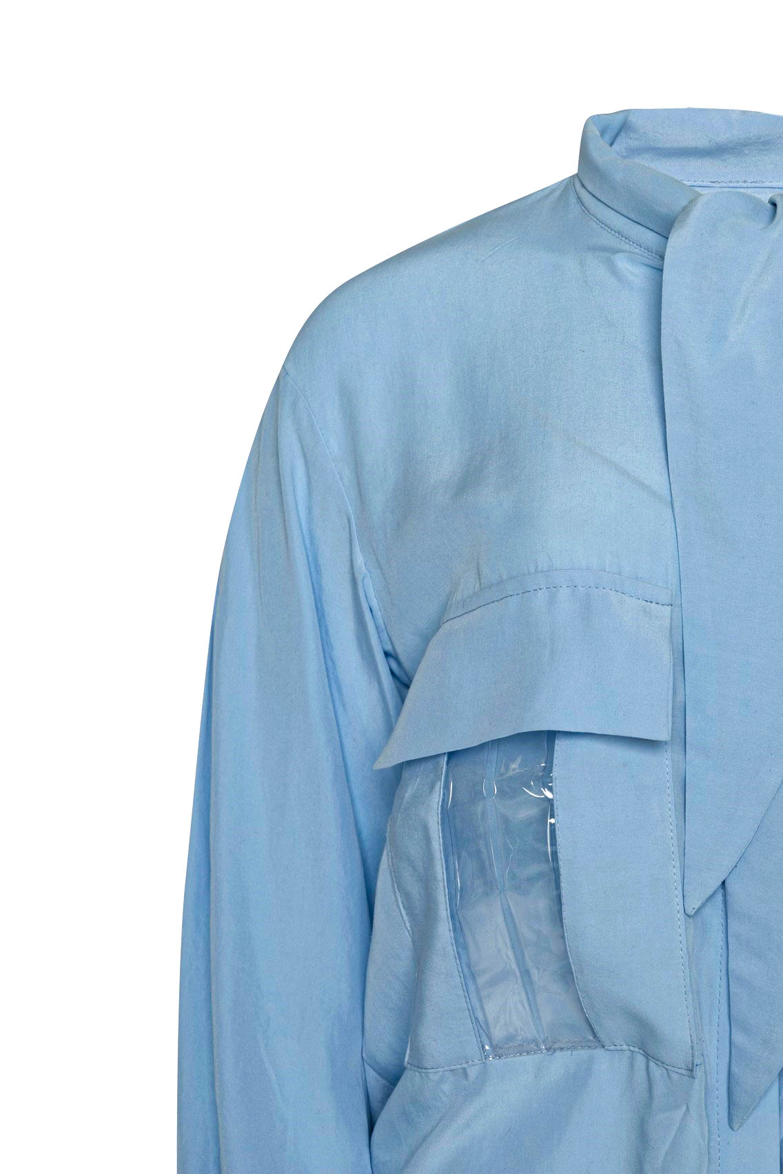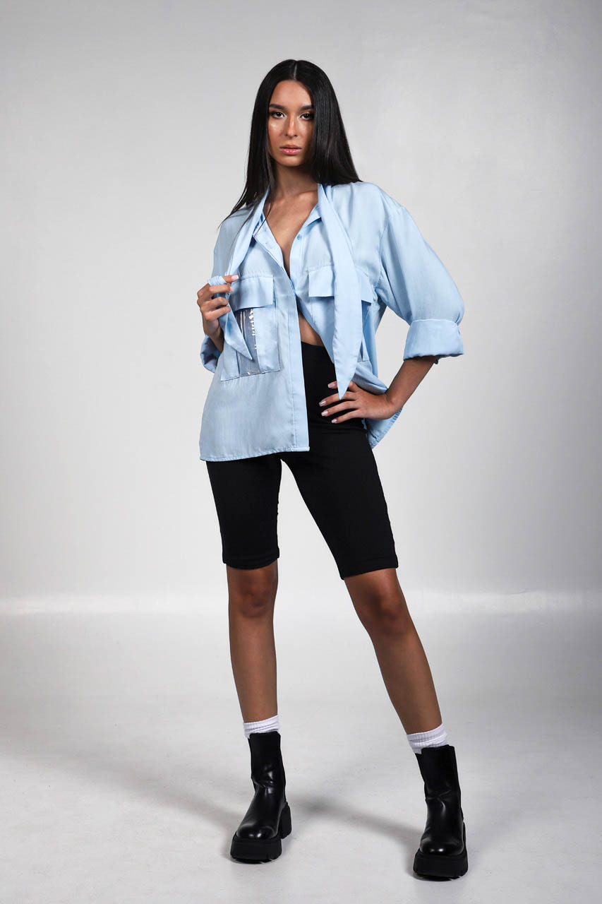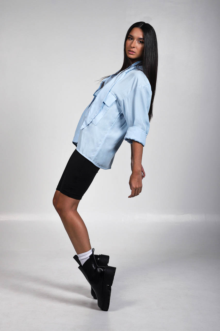 Κλασσικής γραμμής πουκάμισο με στρατιωτικού τύπου τσέπες εμπρός, οι οποίες ξεχωρίζουν διότι έχουν σαν λεπτομέρεια επάνω τους μία διακριτική φάσα από PVC. Λαιμός κανονικός που σχηματίζει εφέ “μαντήλι” ή “γραβάτας” εμπρός. Το κλείσιμο γίνεται με κουμπιά.