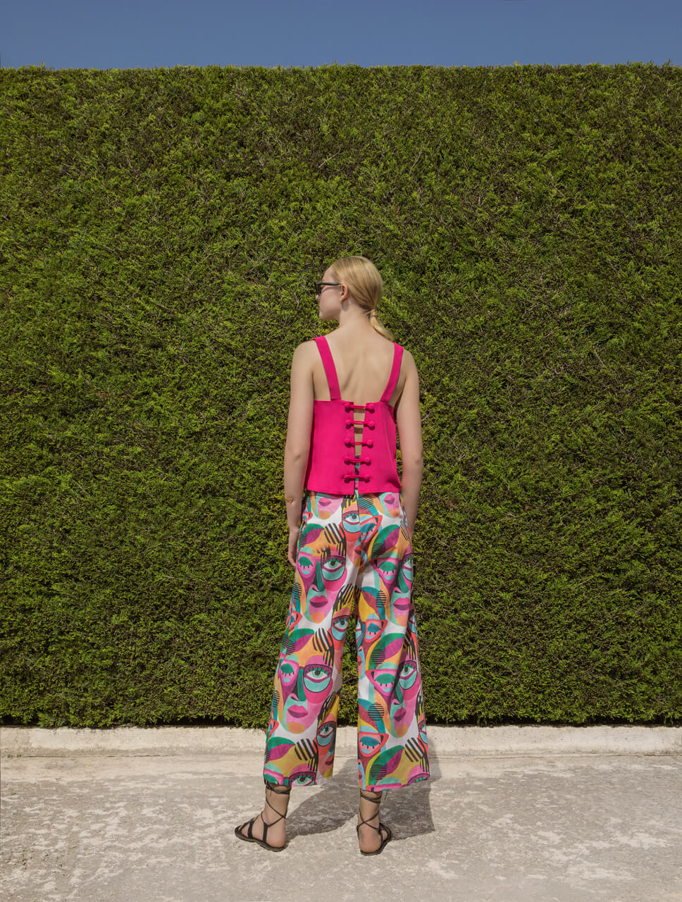 Τοπ loose silky touch με τιράντες. Κουμπώνει στο πίσω μέρος με ελαστικό ρέλι που ενώνει δύο υφασμάτινα κουμπιά αφήνοντας ακάλυπτη κατά μήκος την πλάτη.