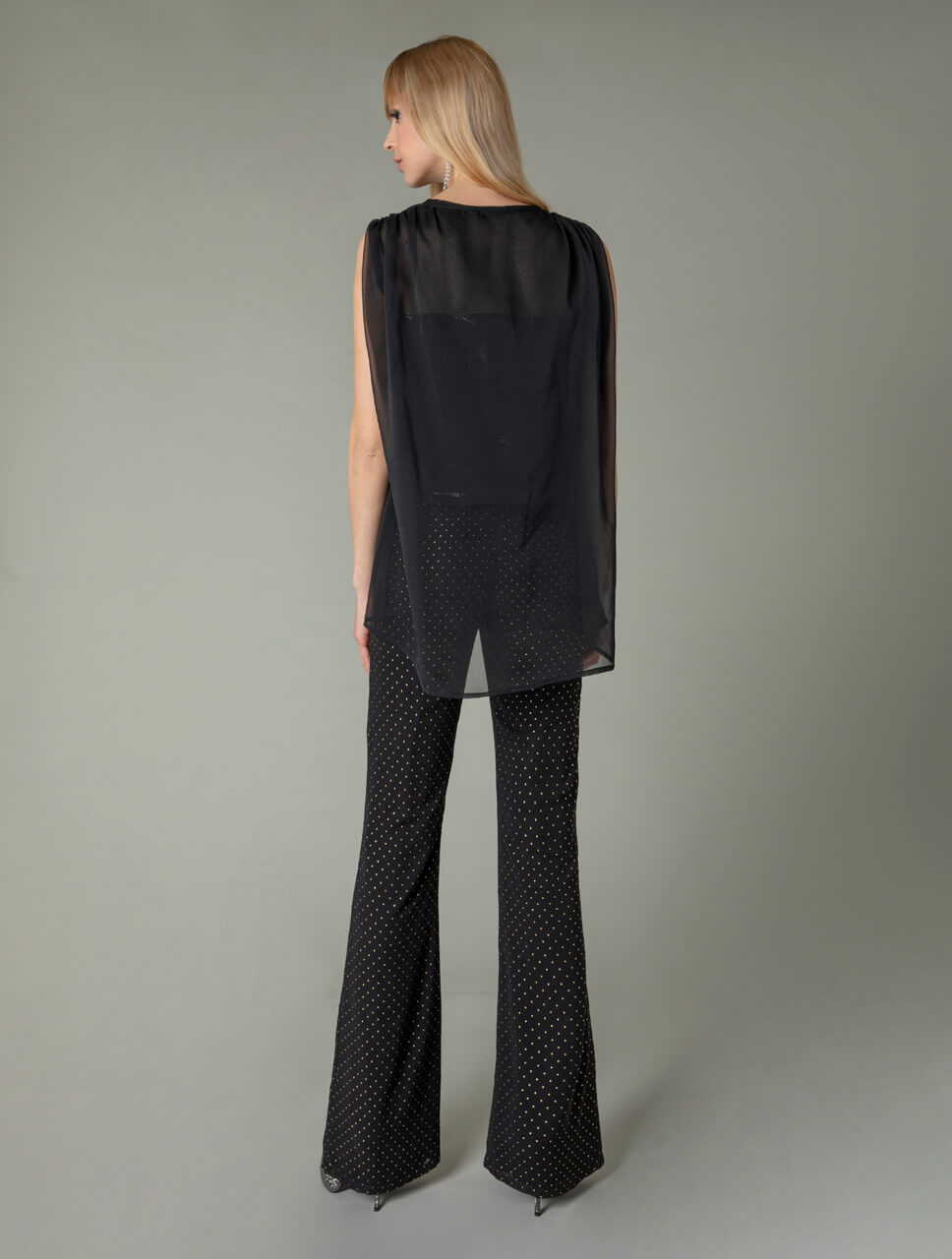Διπλό τοπ από βινύλ τοπ (εσωτερικά) που λειτουργεί ως μπούστο και μουσελίνα (εξωτερικά). Γραμμή loose. Στην πλάτη, υπάρχει επιπρσόθετο κομμάτι μουσελίνας που λειτουργεί ως μπέρτα.