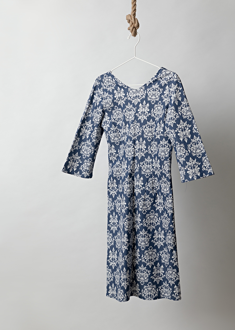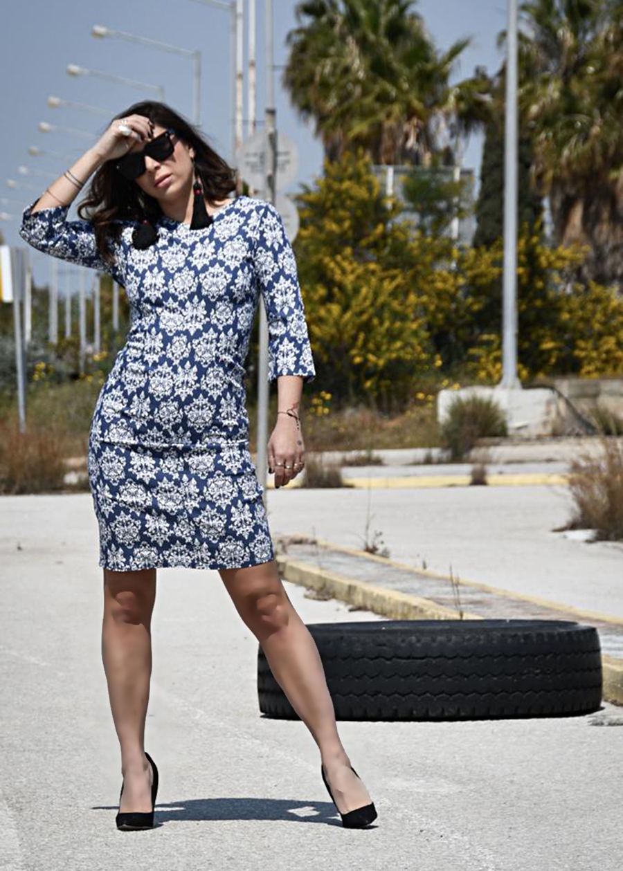 Midi φόρεμα τύπου τζην εμπριμέ με “v” στην πλάτη και φερμουάρ.Ελαστικό. Κλασική γραμμή
