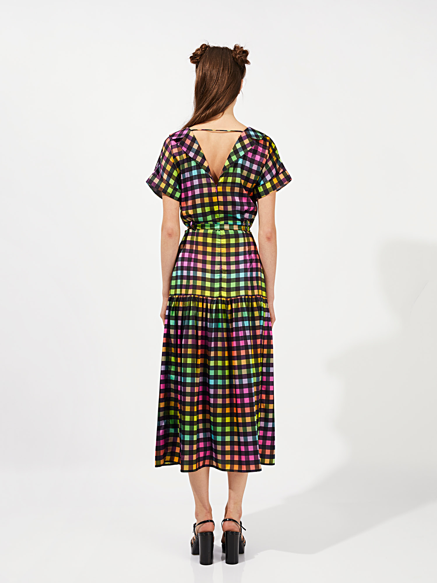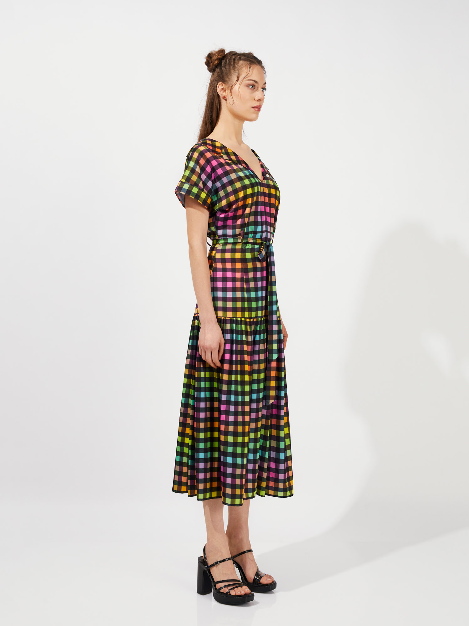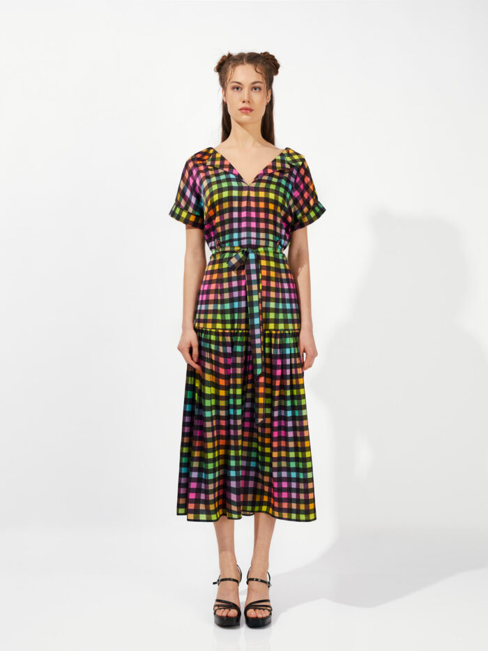 Midi φόρεμα με γιακά (πέτο). Η φούστα (το κάτω μέρος) είναι ψηλόμεση με σούρα. Φερμουάρ στο πίσω μέρος. Ζωνάκι μέσης από το ίδιο ύφασμα.